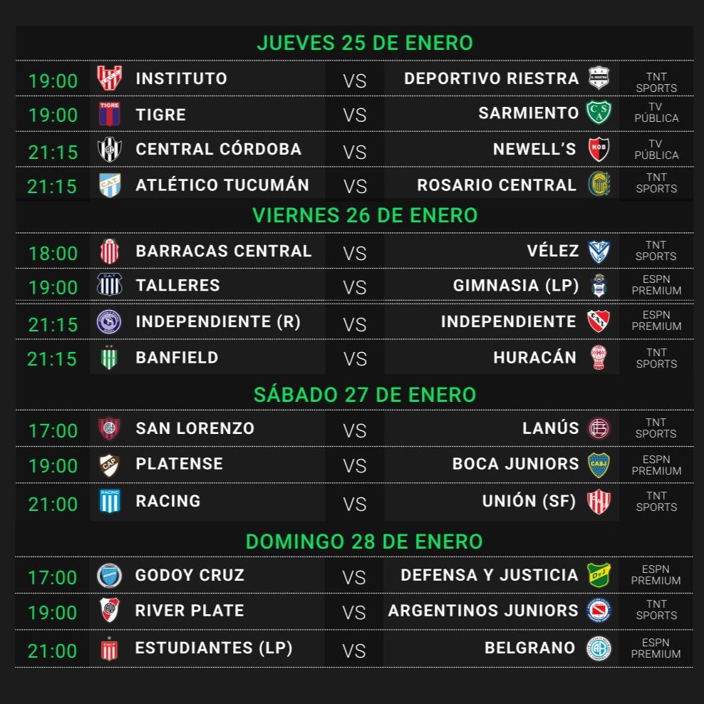 Y uno de los primeros en salir a la cancha es el recientemente ascendido Deportivo Riestra, que vuelve al estadio donde ascendió para enfrentar a Instituto de Córdoba (19 horas). A la misma hora Tigre va a recibir a Sarmiento de Junín; y a las 21:15 habrá dos partidos: el campeón Rosario Central visita a Atlético Tucumán y Central Córdoba de Santiago del Estero recibe al otro rosarino, Newells Old Boys.