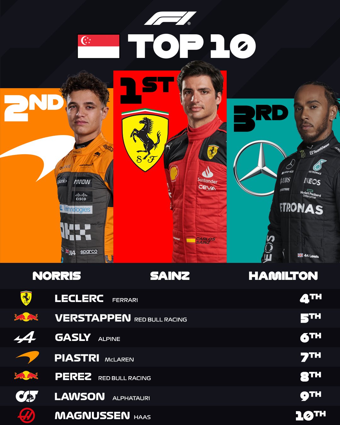 El español Carlos Sainz (Ferrari) ganó esta mañana (noche de Singapur) el Gran Premio de Fórmula disputado en el circuito Marina Bay, seguido por Lando Norris (McLaren) y Lewis Hamilton (Mercedes).