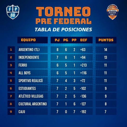 El equipo de la provincia de Buenos Aires completó el día domingo la fecha 8 con una victoria sobre Sportivo Realicó y volvió a la cima de la tabla de posiciones, la cual había perdido el sábado en manos de Independiente de Pico. La victoria sobre los pampeanos fue por 84 a 77. Además, Ferro de Pico le ganó de visitante a Cultural Argentino 78-36.